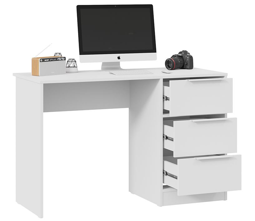 Стильный и минималистичный внешний вид стола создается благодаря белому фасаду и корпусу. Конструкция включает в себя три вместительных ящика для письменных принадлежностей, книг и учебников.