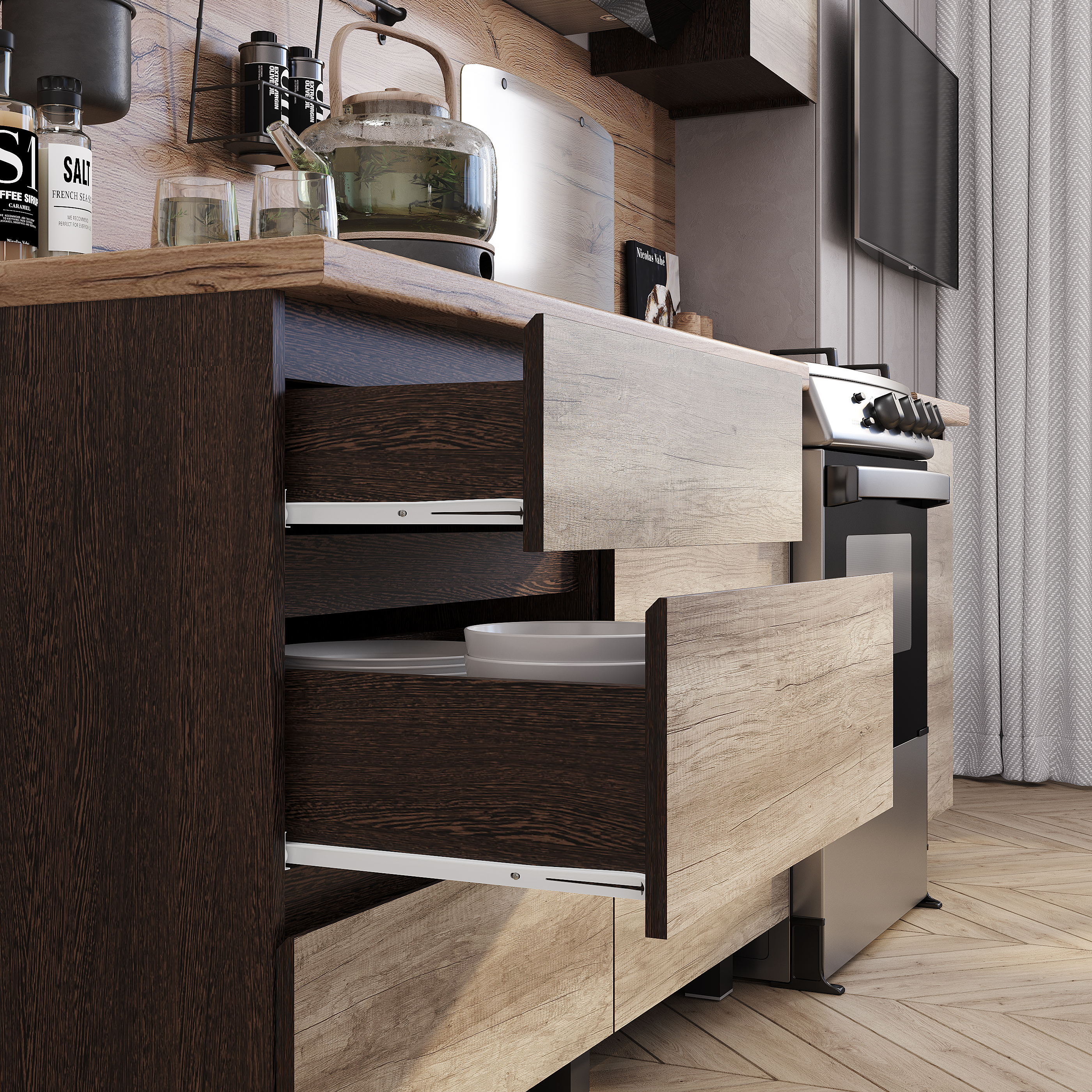 Это гармония природных оттенков и современной функциональности. Дизайн модели вдохновлен текстурой натурального дерева: фасады цвета «дуб каньон» сочетаются с корпусом «венге», создавая эффект благородной древесины. Главная особенность — интегрированные срезы на фасадах, которые заменяют традиционные ручки. Они обеспечивают эргономичный захват и придают гарнитуру цельный, монолитный вид.