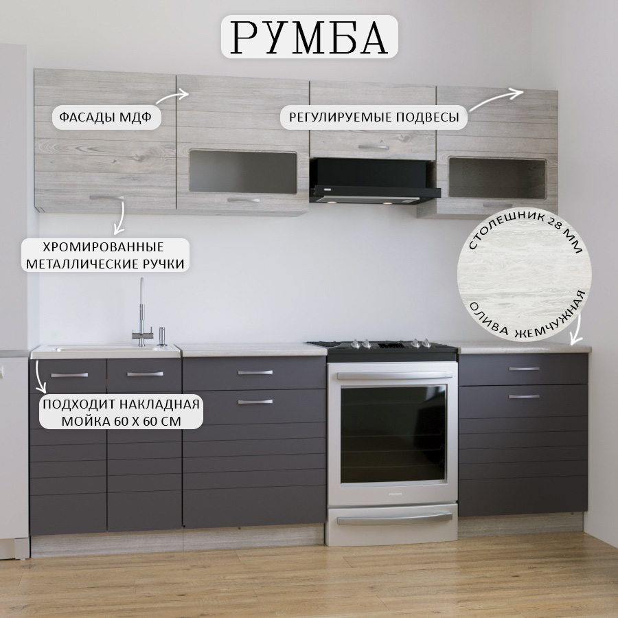 Кухня Румба - полнофункциональная кухня, скомплектованная всеми необходимыми кухонными блоками. Сочетание эстетики минимализма и функциональности! Отсутствие лишних деталей, простота дизайна, стильное цветовое оформление, просторная рабочая поверхность и вместительные шкафы и ящики - это то, что отвечает всем заданным требованиям современной кухни!