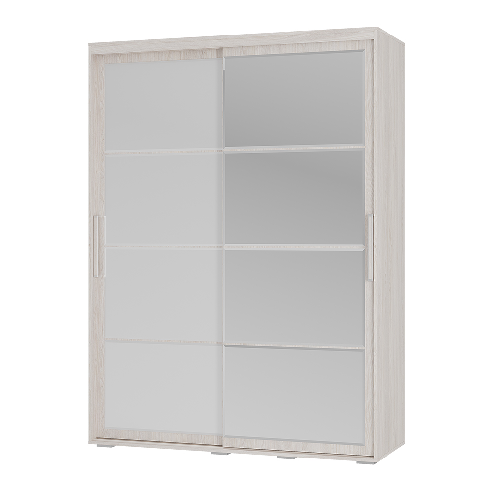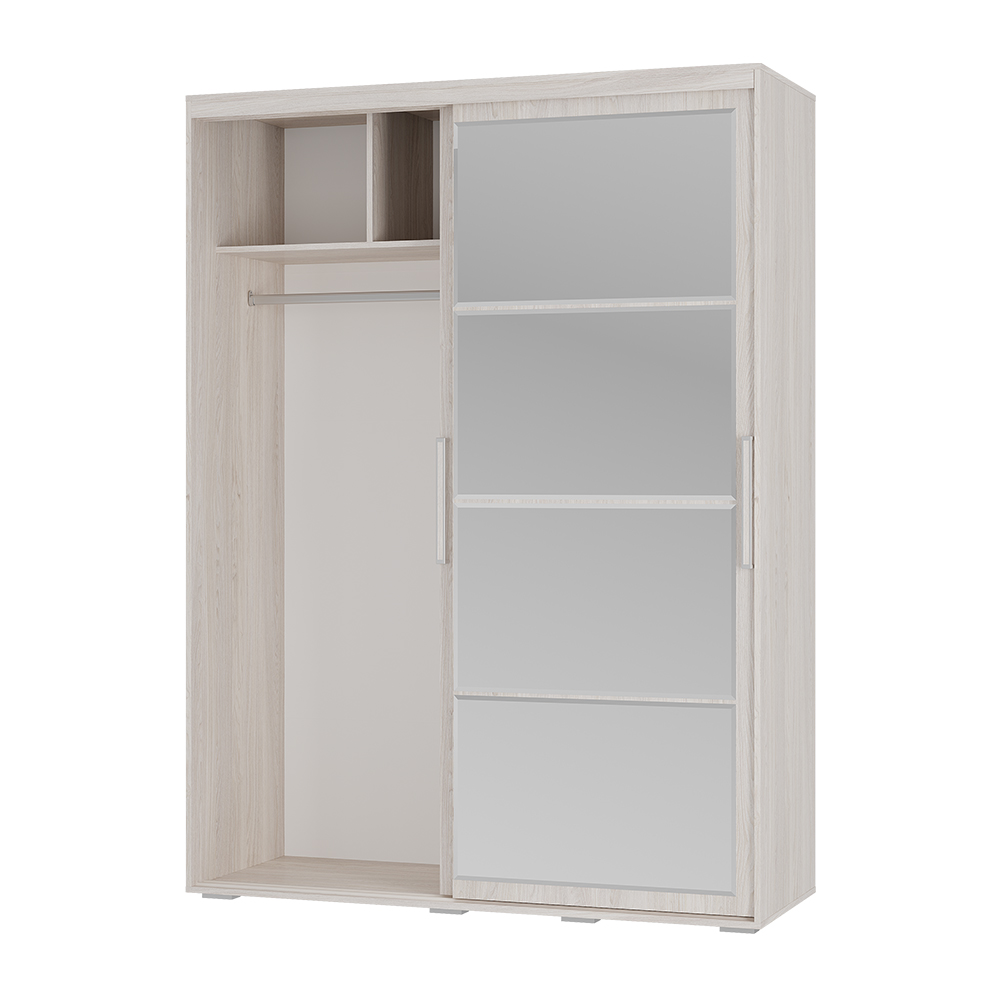 •  Грамотное наполнение: Внутри предусмотрено всё необходимое — плательный отсек с хромированной штангой (772 мм), два выдвижных ящика, антресоль и вместительные полки.
