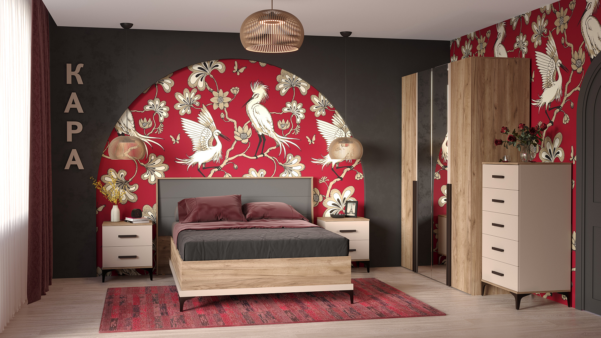 Модульная спальня "Кара" сочетает в себе элементы современного восточного стиля, уникальность и продуманную функциональность. Объединение в дизайне темного древесного декора, контрастного велюра и антрацитовых оттенков, создает идеальный образ для вашего личного пространства.